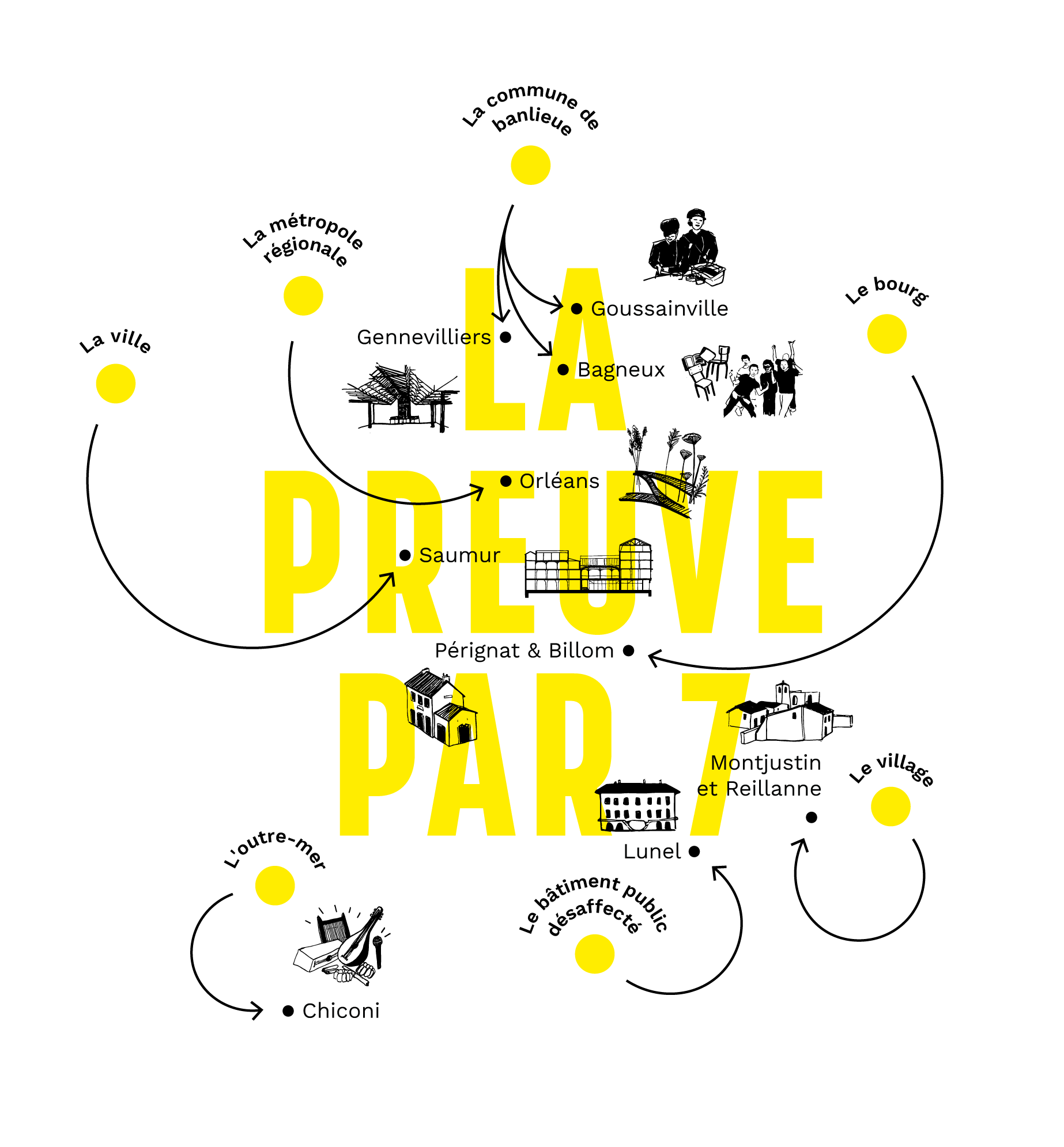 À partir de 2018, la Preuve par 7 est devenue partenaire d’une dizaine de projets d’équipements urbains ou de territoire, répartis en sept échelles, du village à la métropole régionale, qui ont permis, avec les acteurs et actrices locales, de mettre à l’épreuve de manière chaque fois singulière une commande publique territorialisée.
